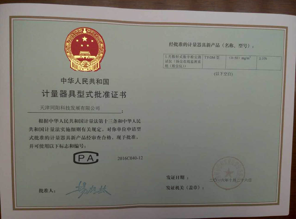 天津同陽TY-DM型揚(yáng)塵在線監(jiān)測(cè)系統(tǒng)取得計(jì)量器具型式批準(zhǔn)證書